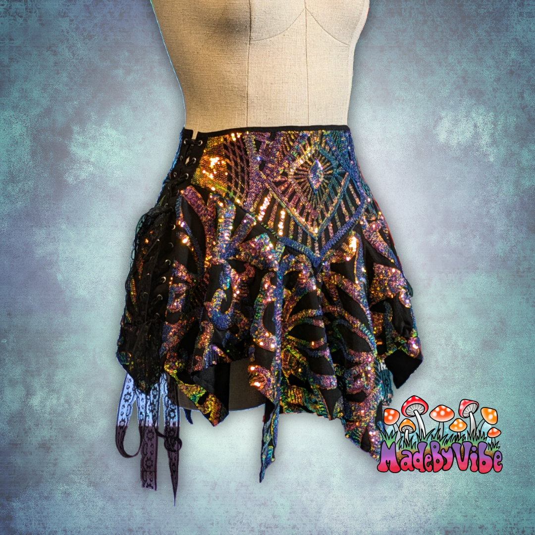 Add a touch of magic to your look with this enchanting fairy skirt. With adjustable lace-up sides and a high-cut waist, it offers the perfect fit that flatters every time. Made with sequin fabric, lined with polyester spandex and broadcloth, it's ideal for raves, festivals, cosplay outfits, and fabulous nights out.