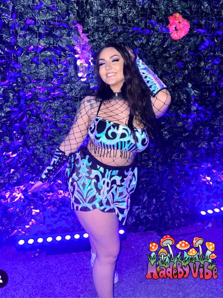 Expertly lined cowl neck halter top featuring intricate beaded fringe. Variations in pattern placement may occur. Ideal for raves, festivals, and a night out.