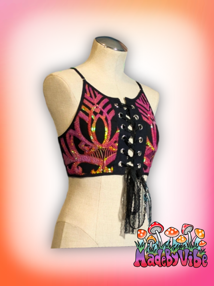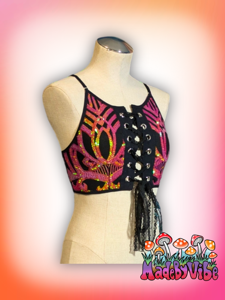 This crop top, featuring a lace-up backless design, is ideal for raves, festivals, and nightlife. Made of a sequin mesh fabric, it is lined with supportive polyester.