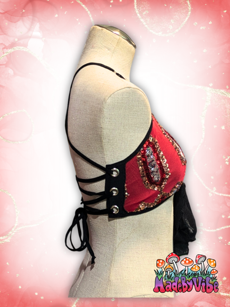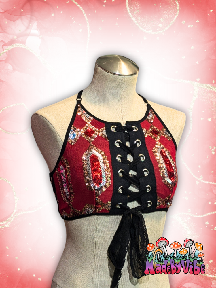 Turn heads and dance freely with this versatile, handmade lace-up crop top from Made by Vibe. Featuring a trendy lace-up front and racerback-style open back, this crop top provides the perfect balance of style and support. Fully lined for added comfort, it’s designed to flatter every body type, making you feel confident whether you're raving, dancing at festivals, or enjoying a casual night out. Bonus: it’s swim-ready too!