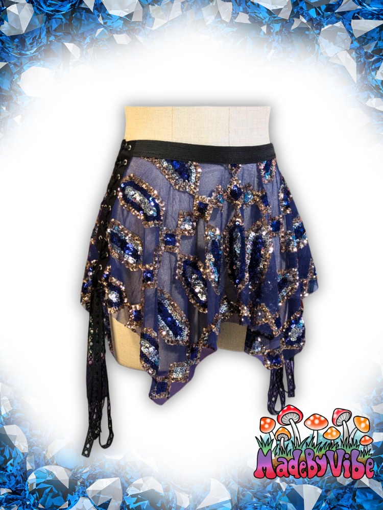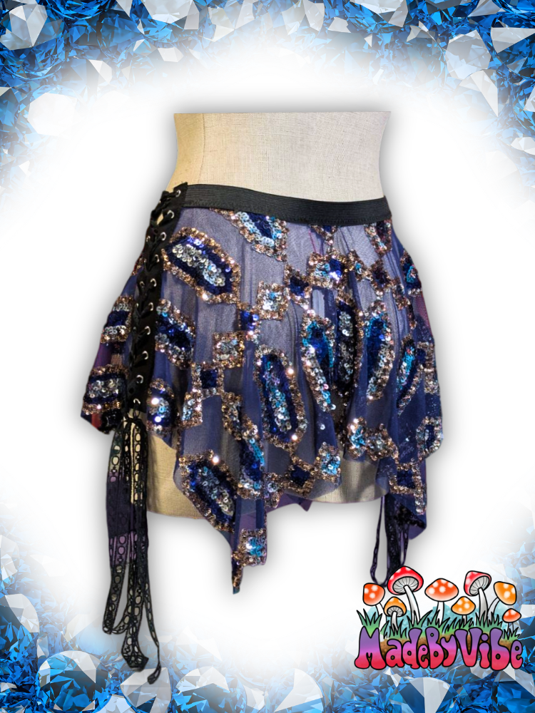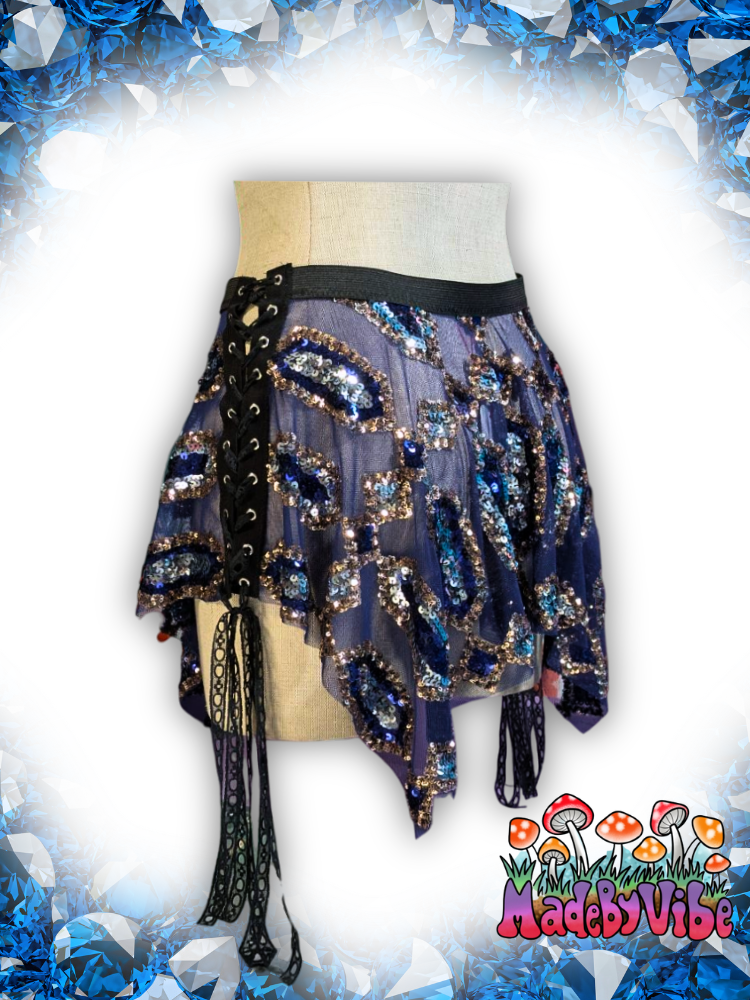 Take a risk and stand out in this handcrafted micro pixie skirt, complete with an elastic waistband and lace-up sides. Perfect for those who love adventure and raves alike.