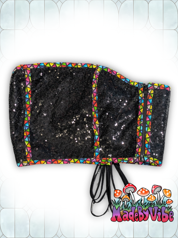 One of a kind cropped corset top. Featuring black sequin fabric and a stained glass trim. Lace up back and zip up sides for ease of wear and a perfect fit. Lined with cotton fabric. Not boned.